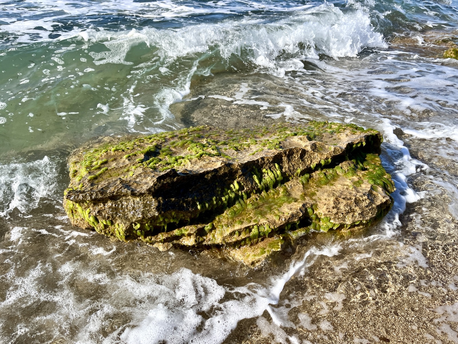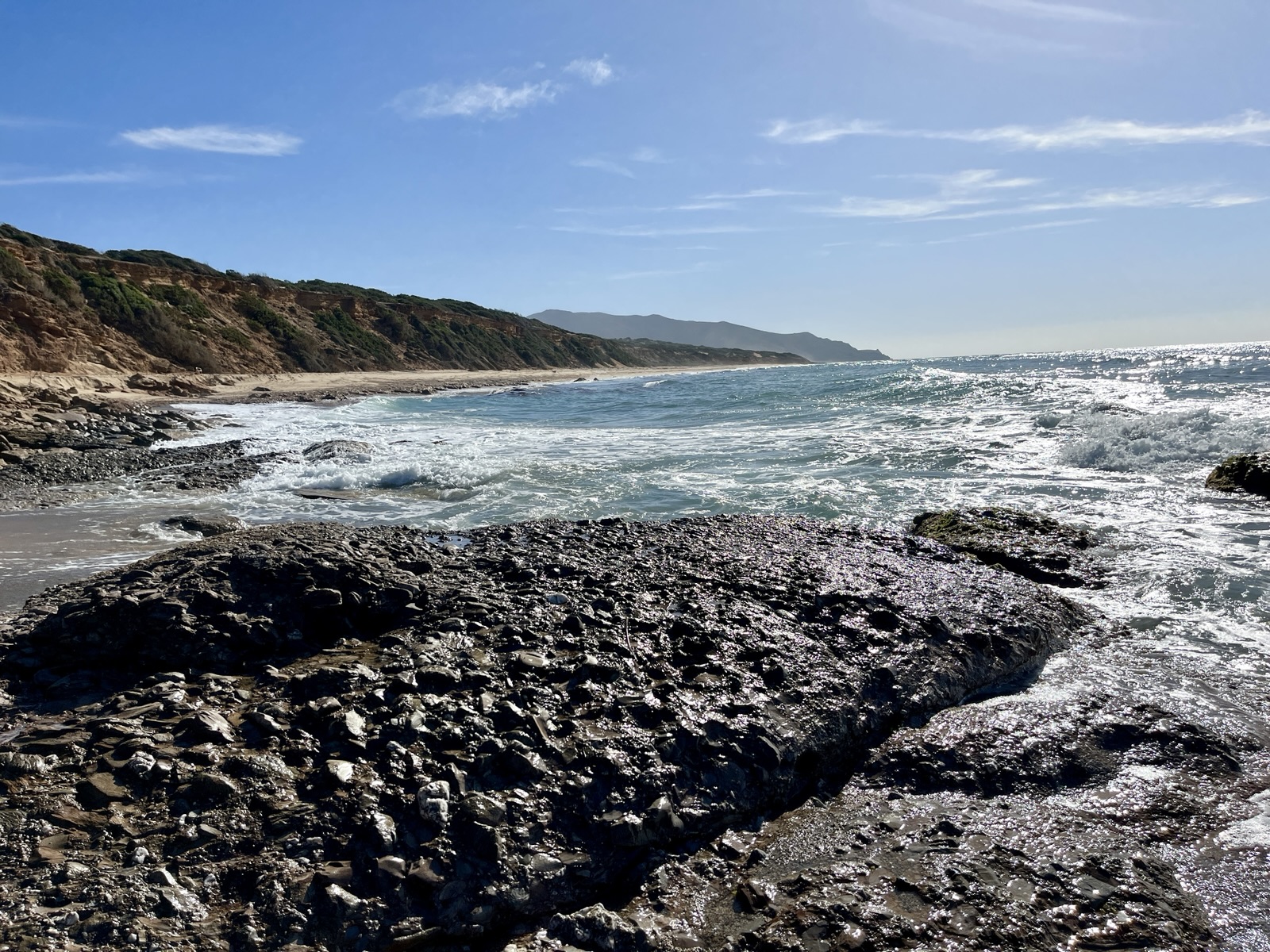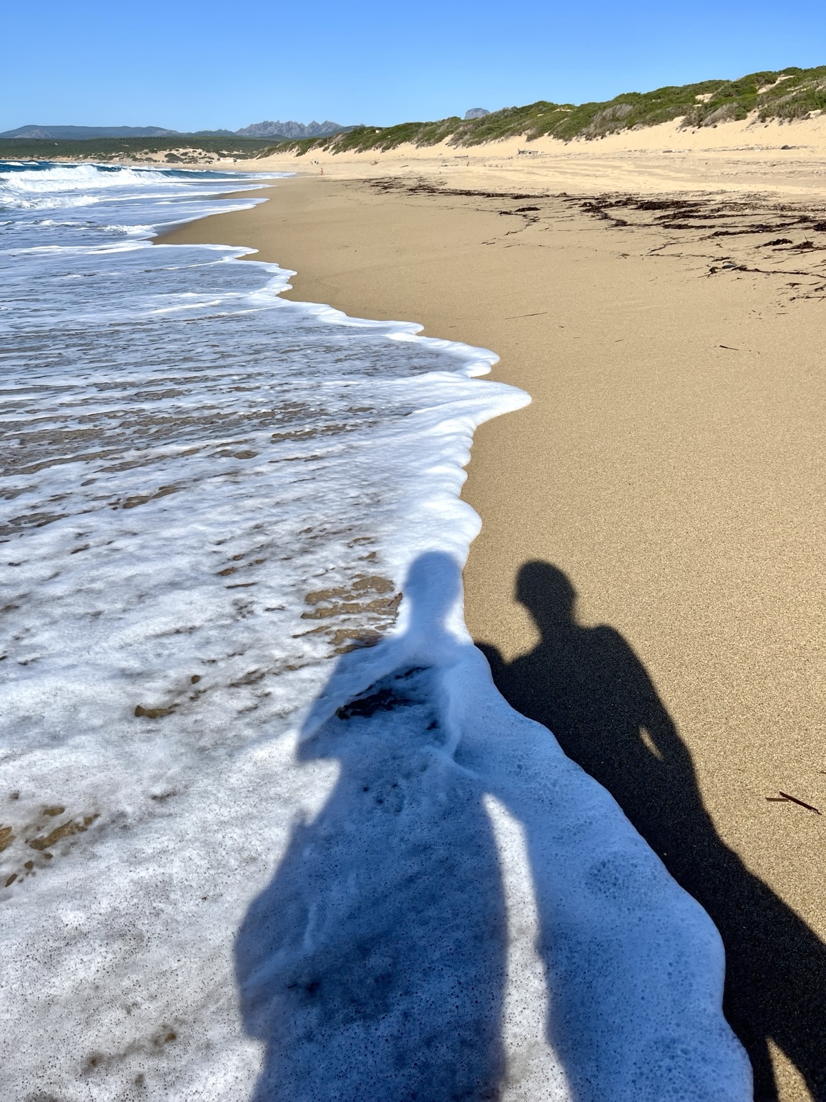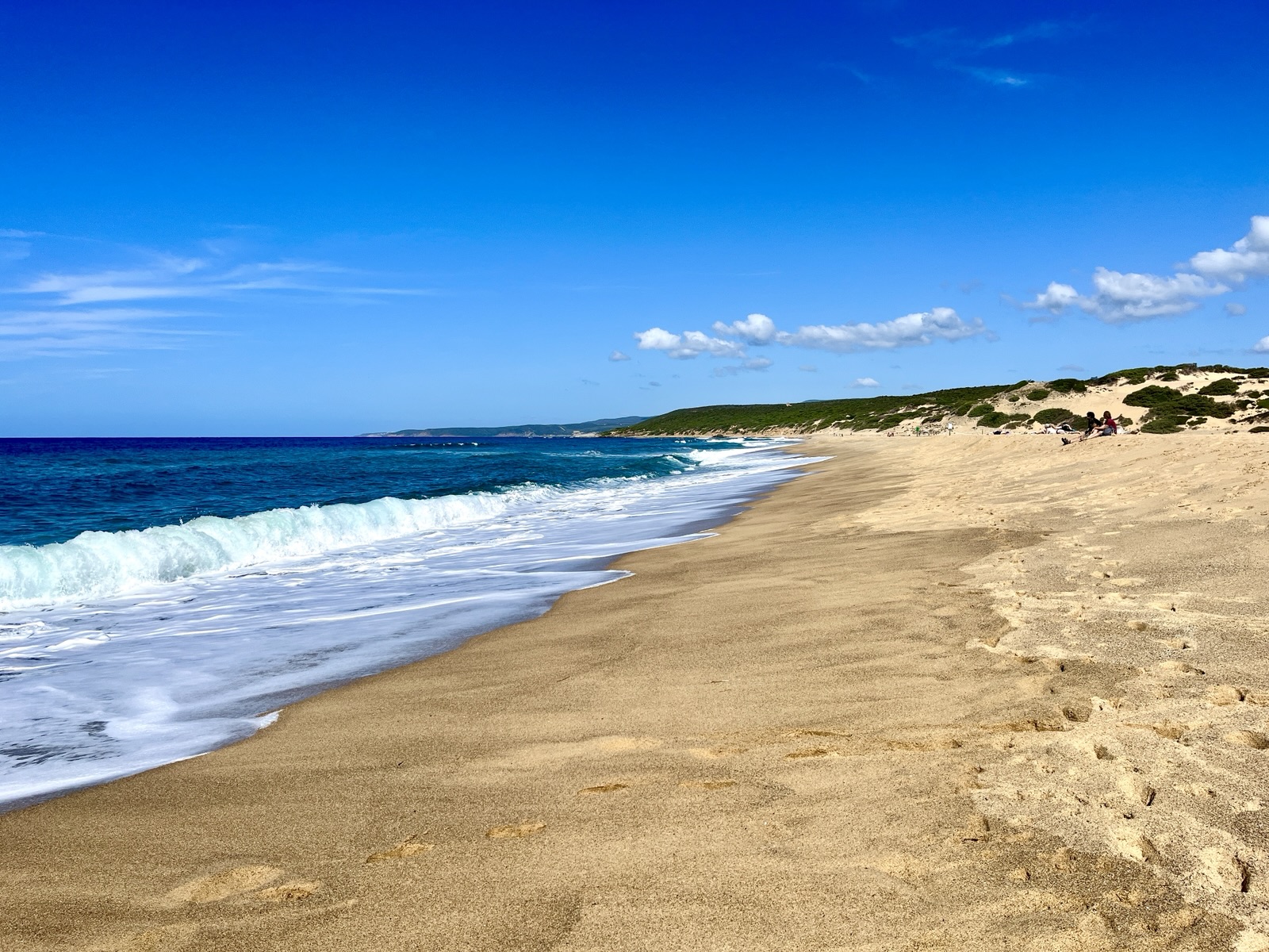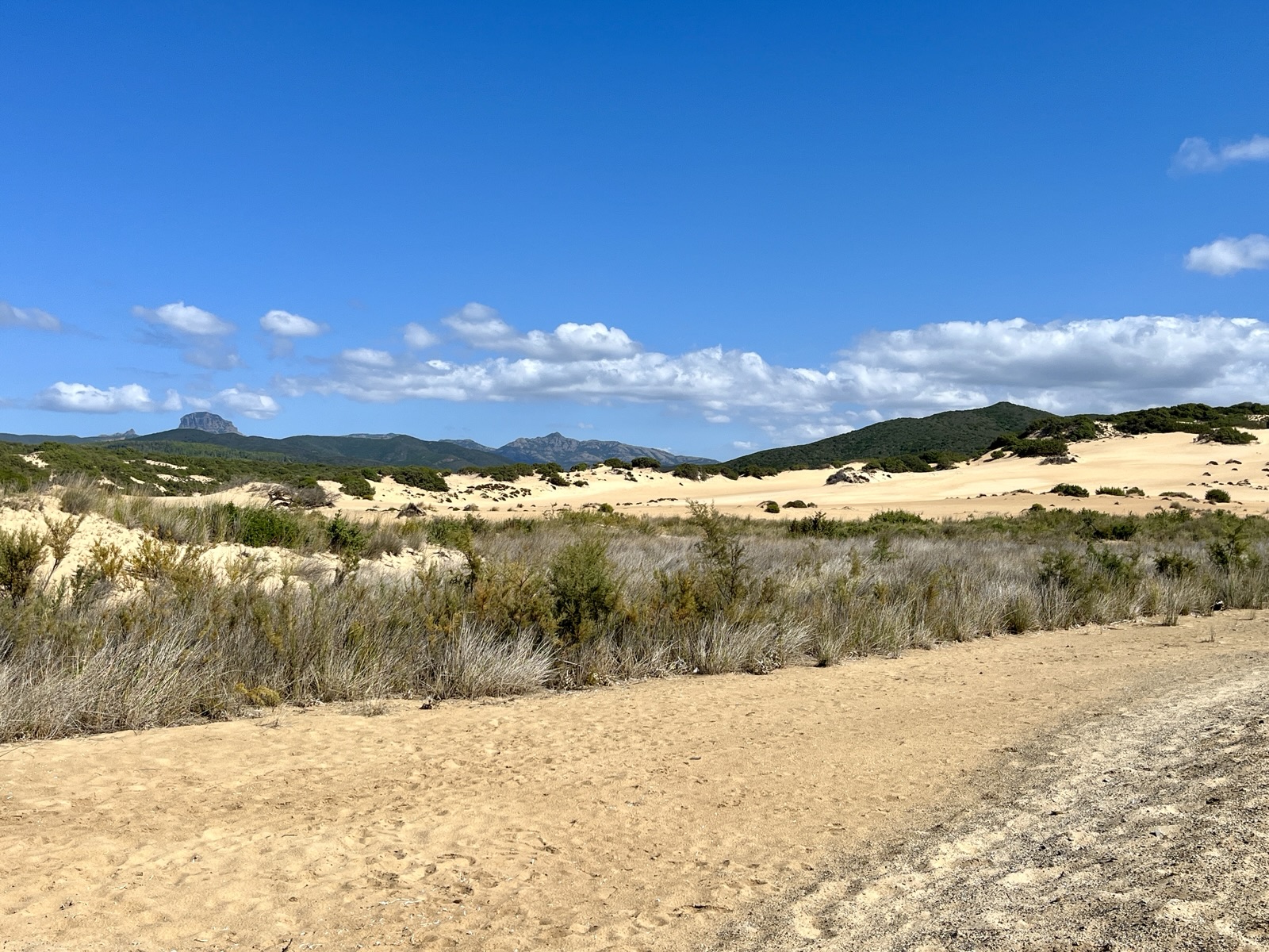 Aber die Gegend übt einen magischen Reiz aus, denn sie gehört laut unserem Reiseführer „zu den ökologisch wertvollsten Gebieten Italiens“. Und die wollen wir natürlich aus der Nähe erleben. Wir lassen also den Wohnwagen auf dem Campingplatz bei Buggerru stehen und machen die Tour nur mit dem Auto, das über einen Off-Road-Modus verfügt. Wichtigstes Gebot auf der Schotterpiste: langsam fahren. So kommen wir auch heil und ohne Blessuren am Auto am Strandparkplatz an. Prima. Erstmal einen Cappuccino 😉.