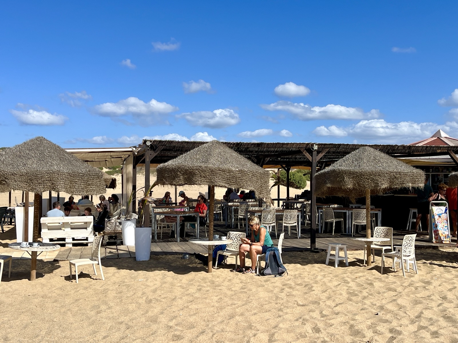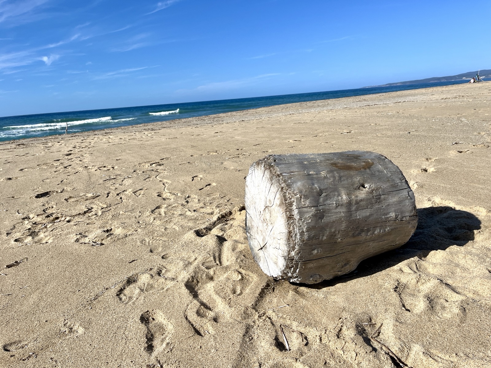 Der Strand ist phänomenal. Er zieht sich – wie die Dünen im Hintergrund – kilometerlang in beide Richtungen, das jeweilige Ende verschwindet im sommerlichen Dunst. Nach wenigen hundert Metern ist er fast menschenleer. Wir gehen einfach immer weiter und freuen uns am blautürkisfarbenen Meer, dem feinkörnigen Sand und dem weiten Blick.