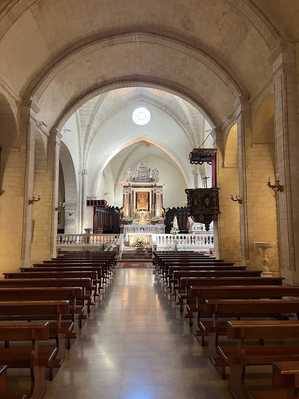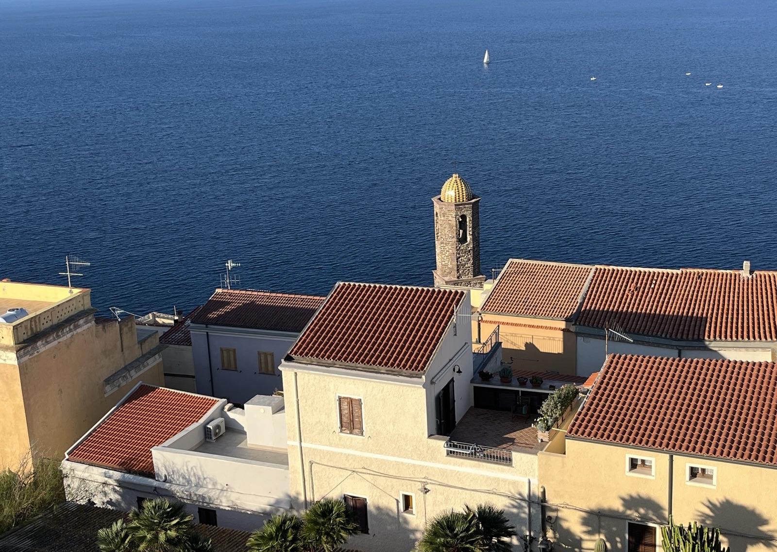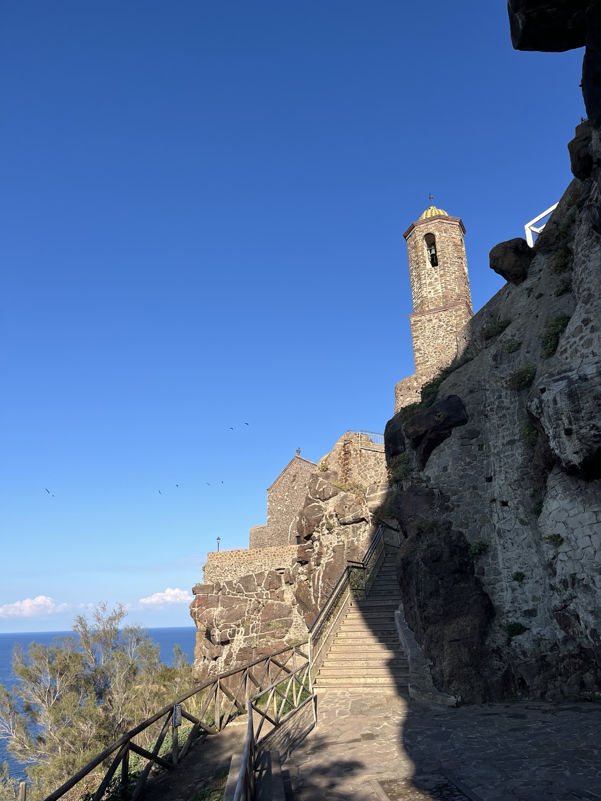 Am Burgberg angekommen machen wir zunächst einen Abstecher in die kleine Kathedrale Sant‘Antonio Abate. Sie steht auf einem Felsvorsprung über dem Meer, daneben der freistehende Glockenturm, der mit einem bunten Majolika-Dach verziert ist.