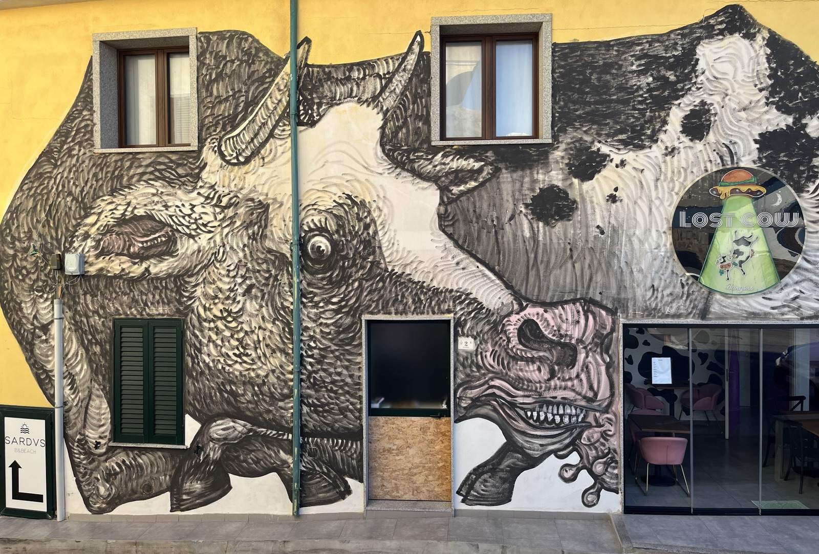 Dann entdecken wir rechter Hand auf einer Hauswand eine überdimensionale Kuh.