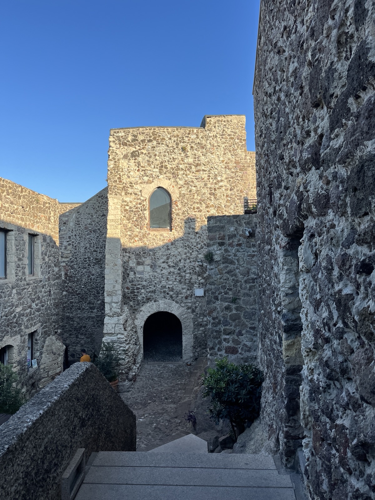 Das Städtchen mit seinen pastellfarbenen Häusern wirkt wie an einen massiven Fels geklebt. Und hoch oben thront eine Festung. Und genau dort wollen wir hin, nachdem wir das Auto am kleinen Hafen geparkt haben. Zunächst geht’s an der Straße entlang, vorbei am gut geschützten Stadtstrand (Spiaggia La Marina).