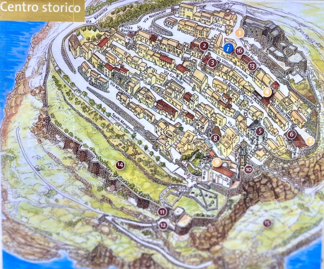 Das Städtchen mit seinen pastellfarbenenHäusern wirkt wie an einen massiven Fels geklebt. Und hoch oben thront eine Festung. Und genau dort wollen wir hin, nachdem wir das Auto am kleinen Hafen geparkt haben. Zunächst geht’s an der Straße entlang, vorbei am gut geschützten Stadtstrand (Spiaggia La Marina).