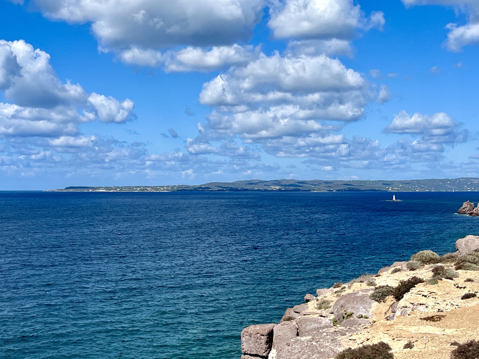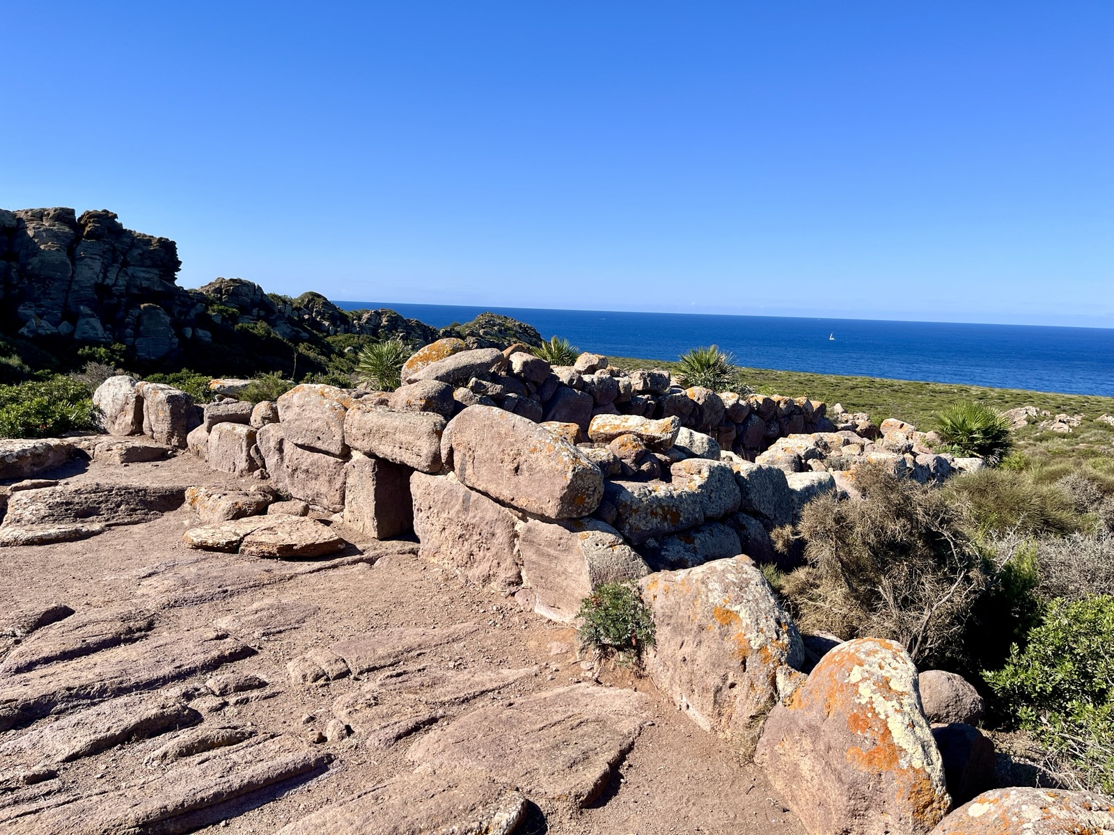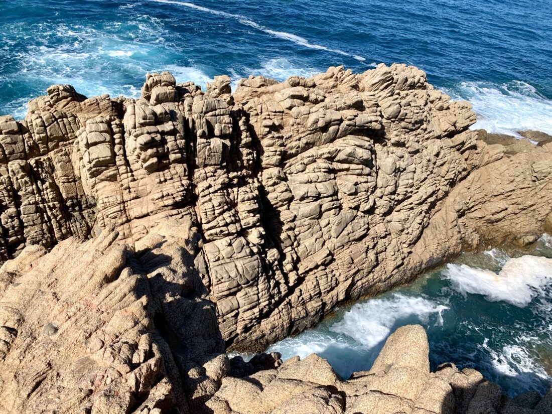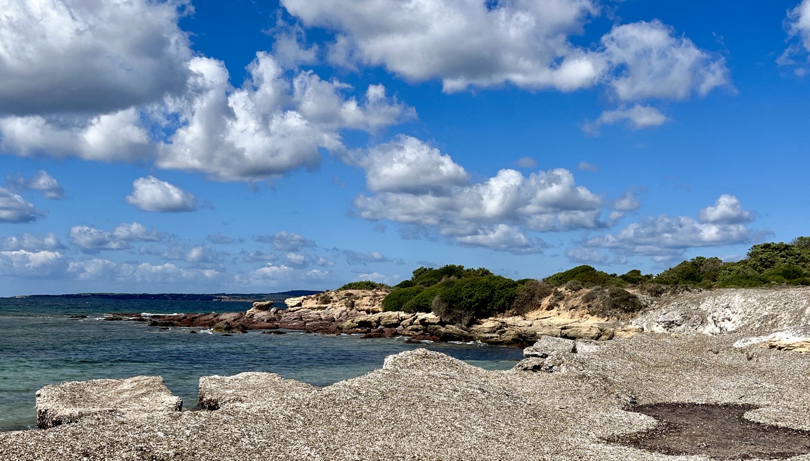 Das Kap Pecora wirkt wie ein Gruß aus der Bretagne. Das Meer ist mehr oder weniger aufgewühlt, und der Strandbereich ist übersät von ovalrunden Granitsteinen in unterschiedlicher Größen, manche ähneln Dinosauriereiern.