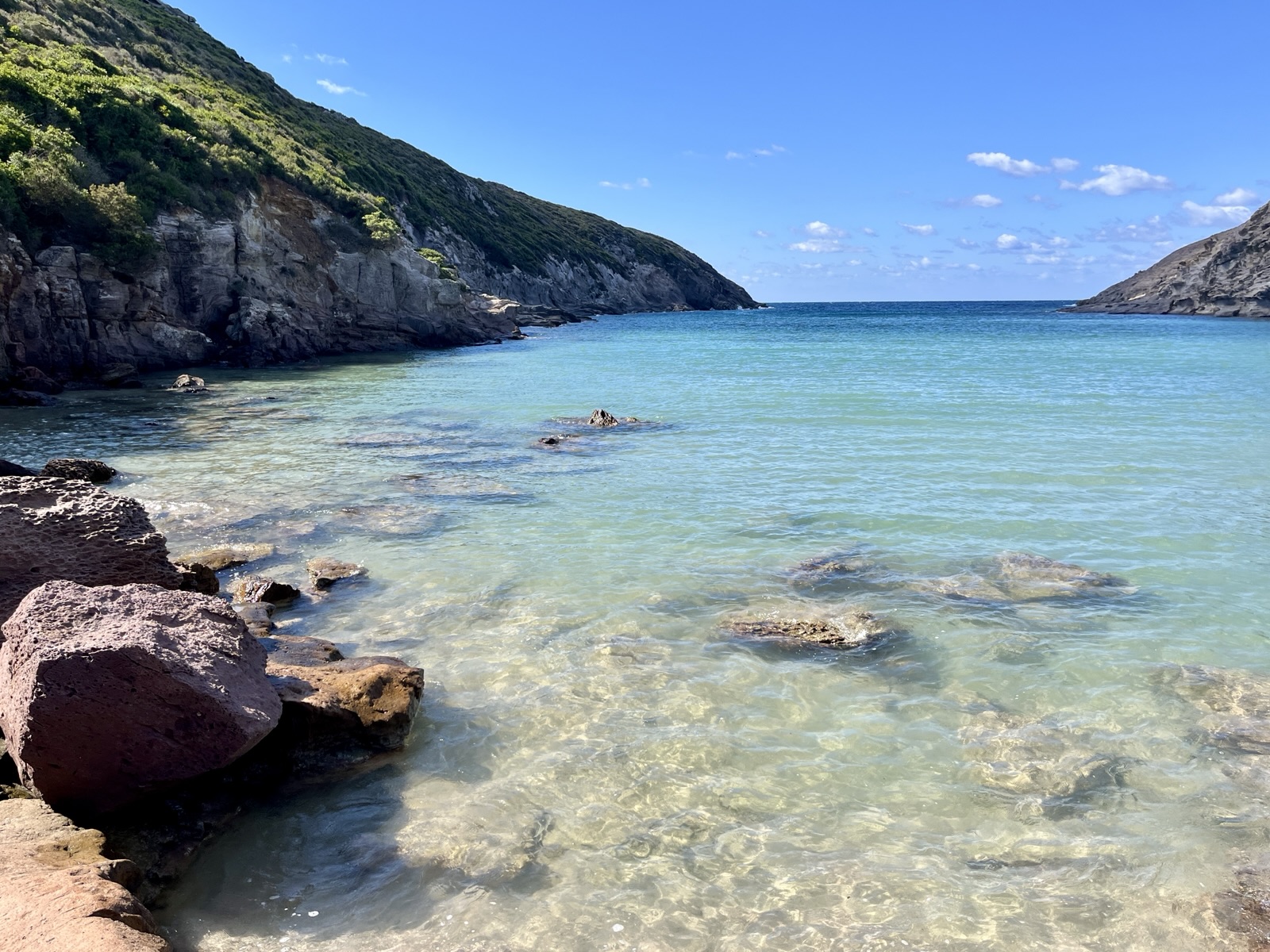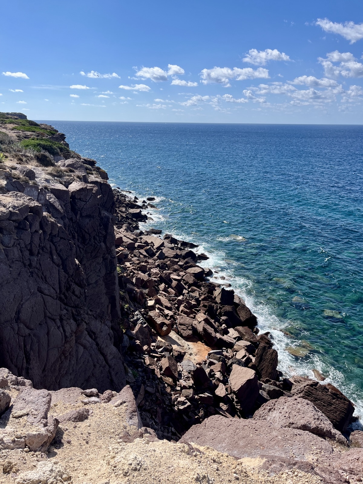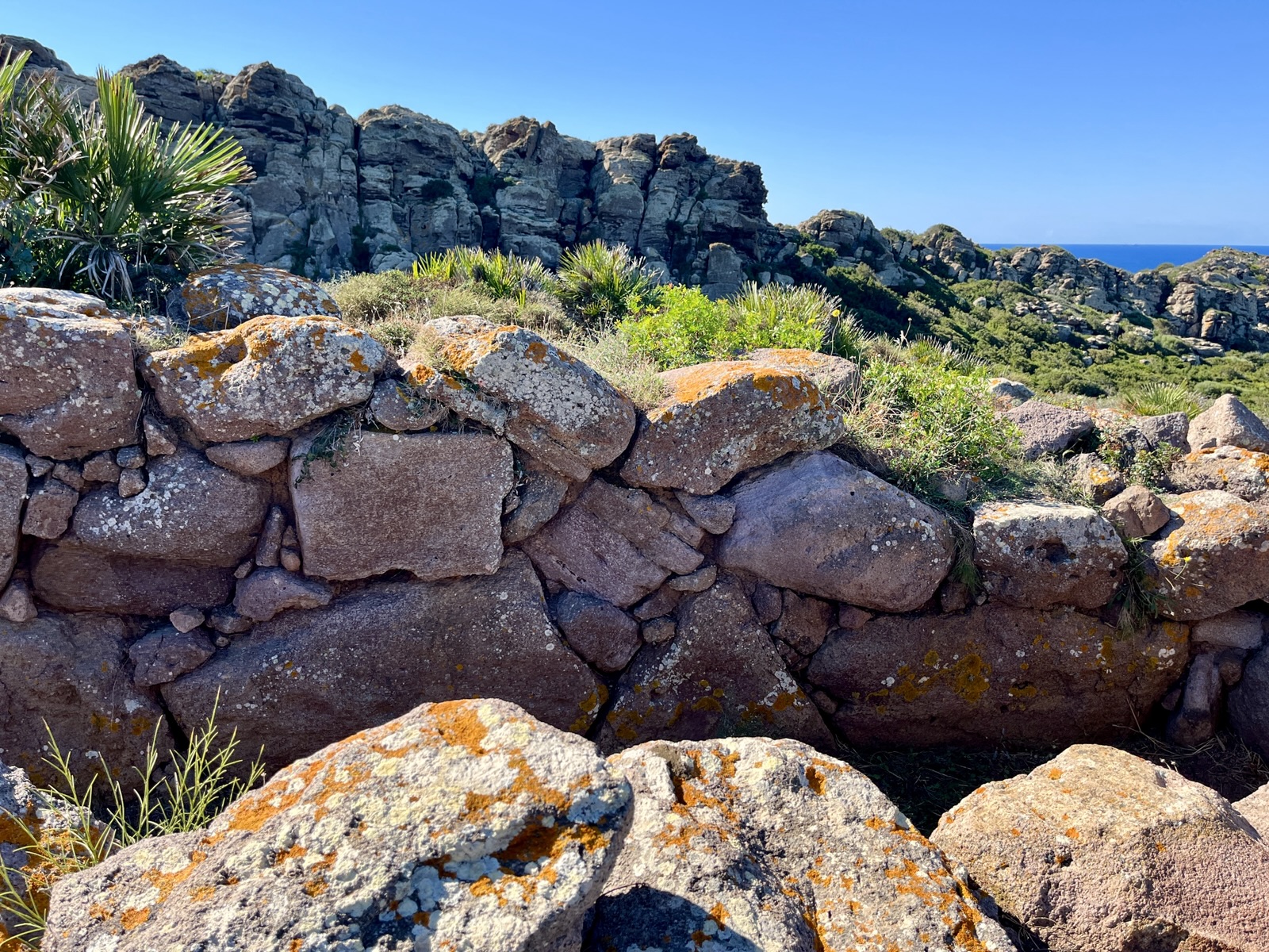 Das Kap Pecora wirkt wie ein Gruß aus der Bretagne. Das Meer ist mehr oder weniger aufgewühlt, und der Strandbereich ist übersät von ovalrunden Granitsteinen in unterschiedlicher Größen, manche ähneln Dinosauriereiern.