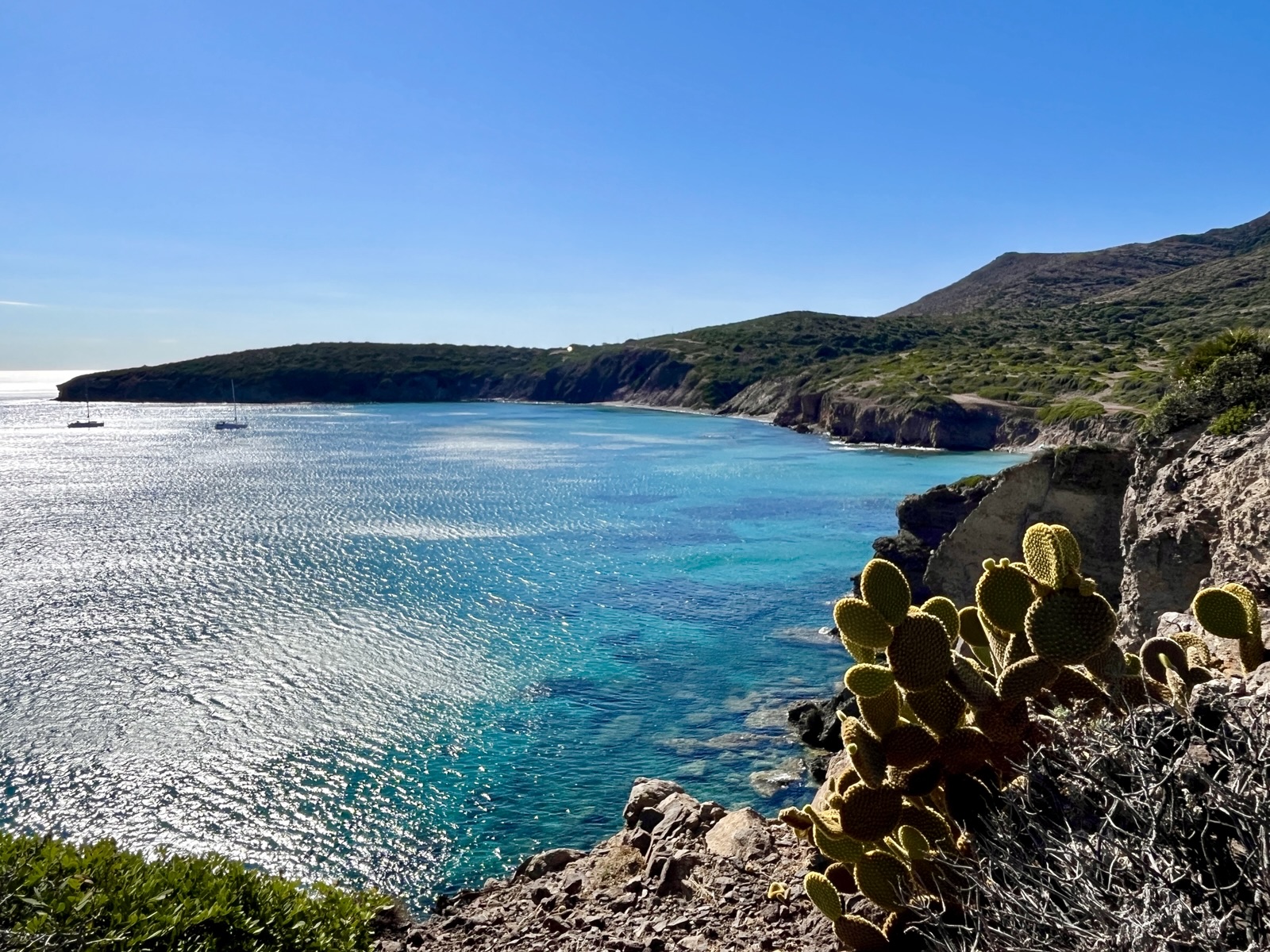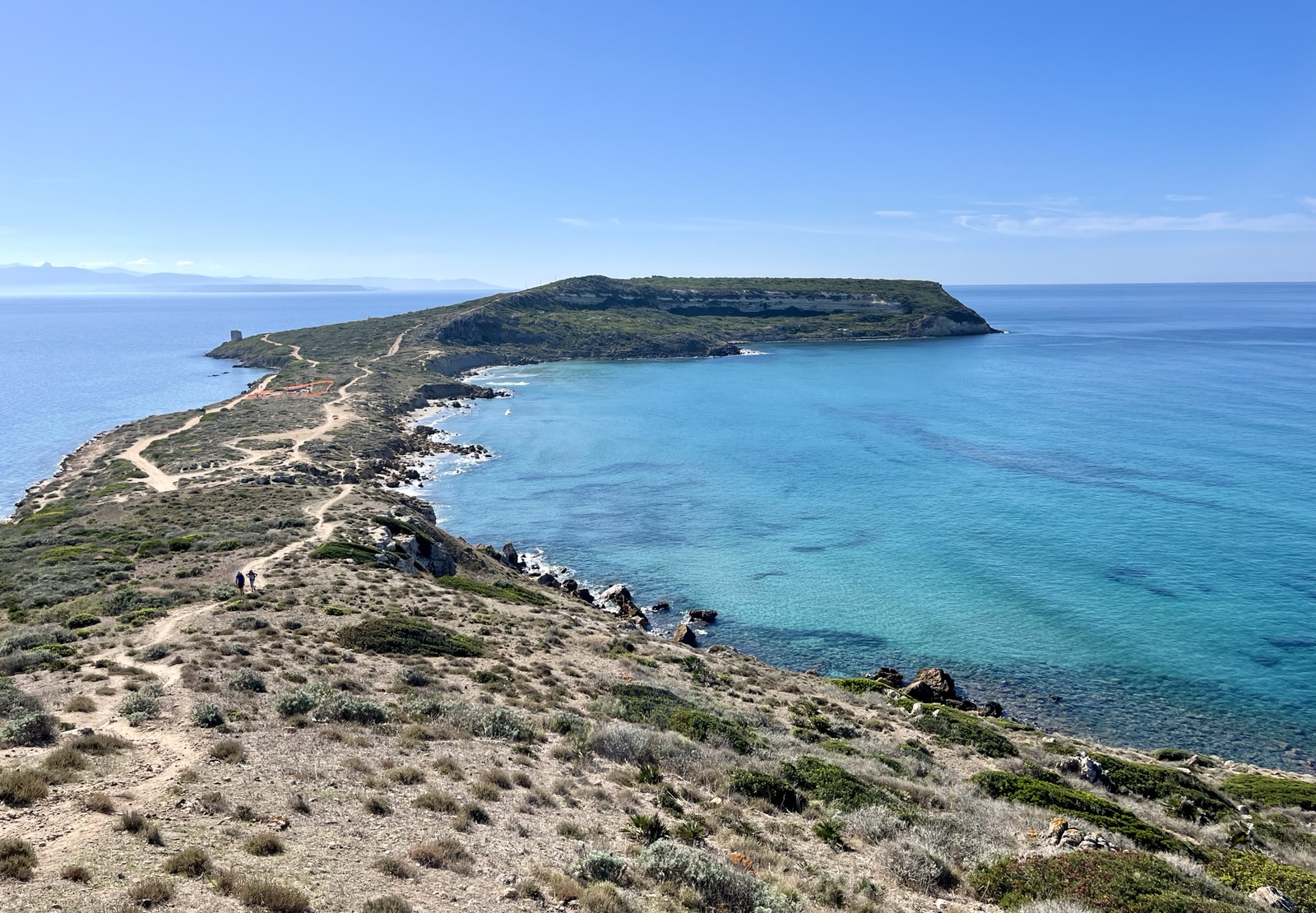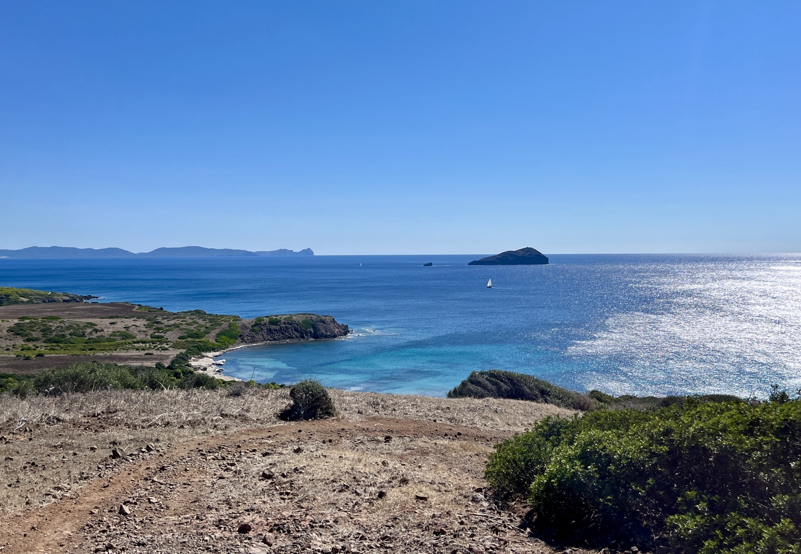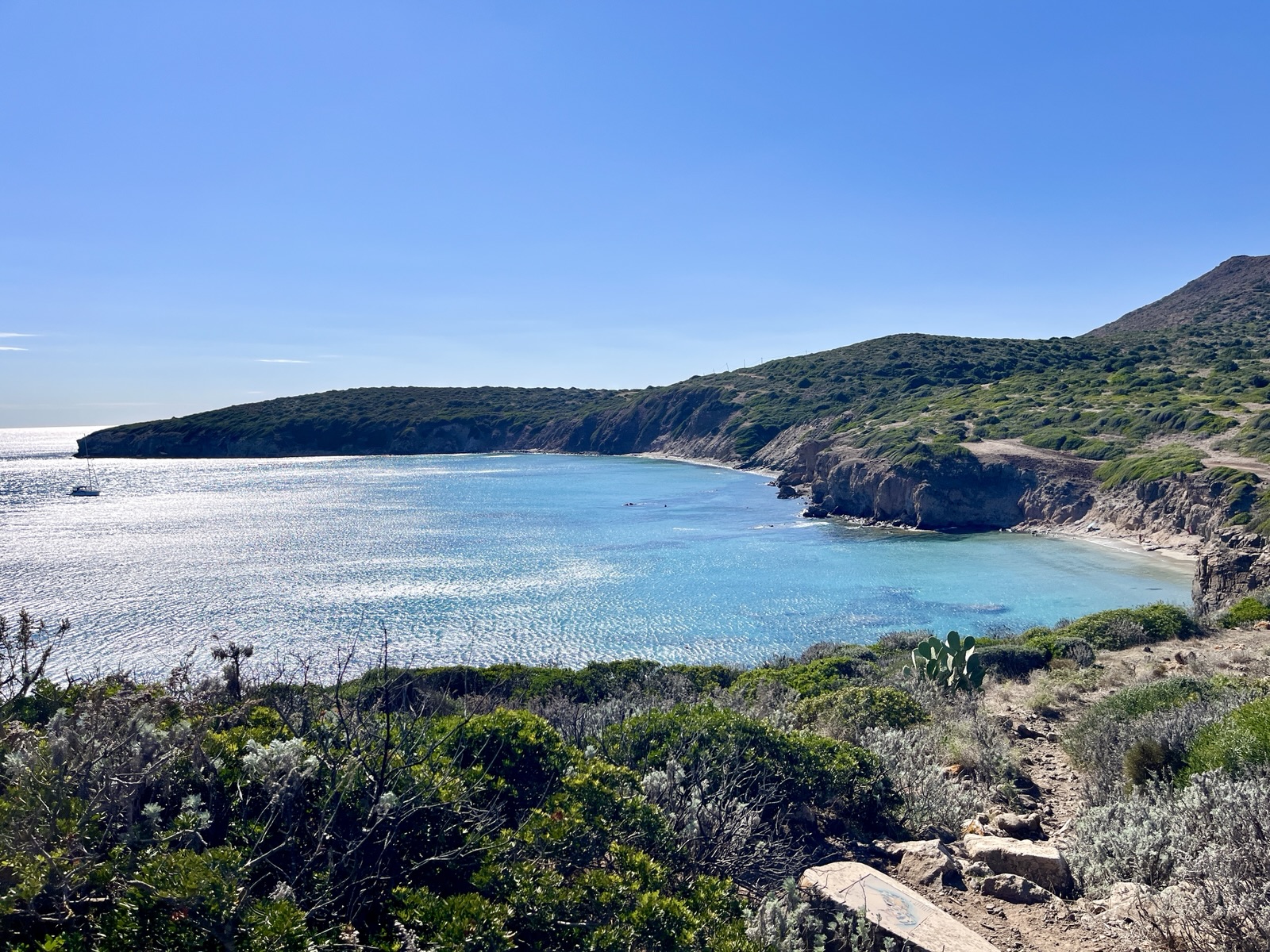 Wir haben hier Anfang Oktober 2025 vier Tage verbracht und die Insel von einem Campingplatz (Camping Tonnara, etwa auf halber Höhe auf der Westseite) aus vor allem per Fahrrad und zu Fuß erkundet. Der Campingplatz ist in Terrassen angelegt und hat eine sehr gute Infrastruktur, einschließlich eigenem Pizzabäcker und einer sehr coolen Bar). Er liegt direkt an einem kleinen Strand (Cala Sapone), der auf beiden Seiten von einer Felszunge umgeben ist.
