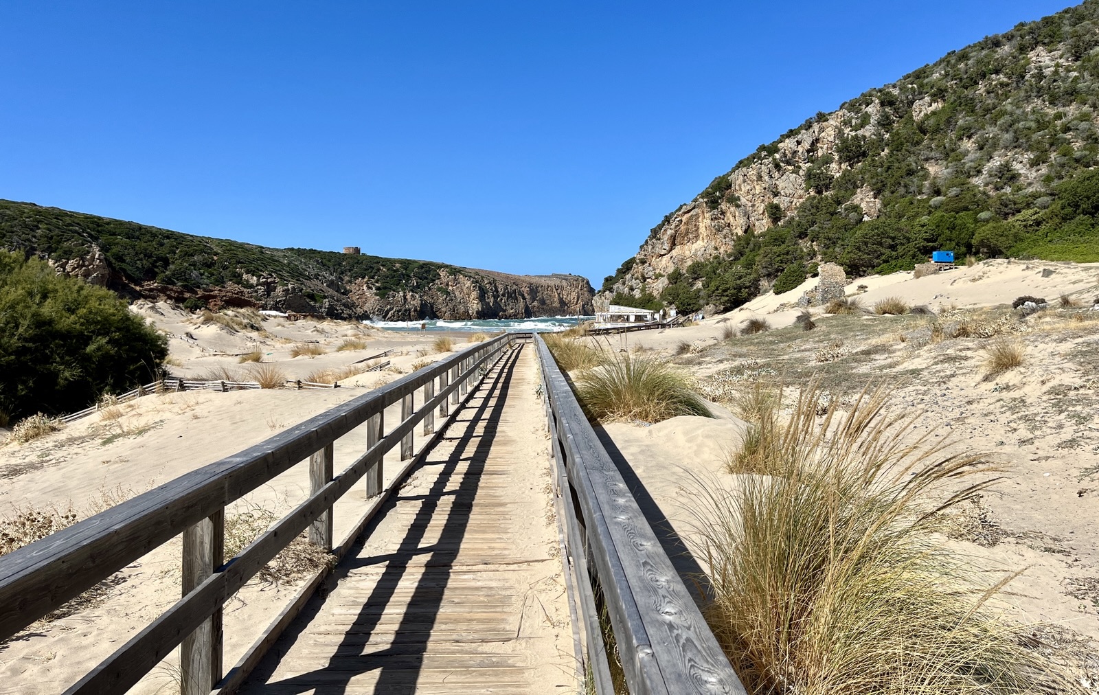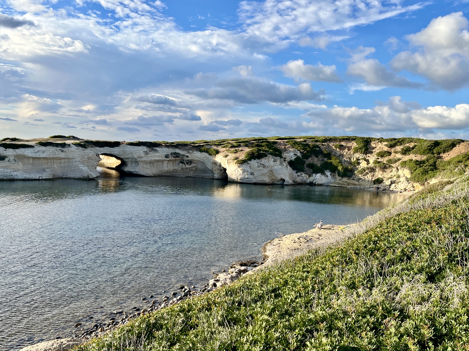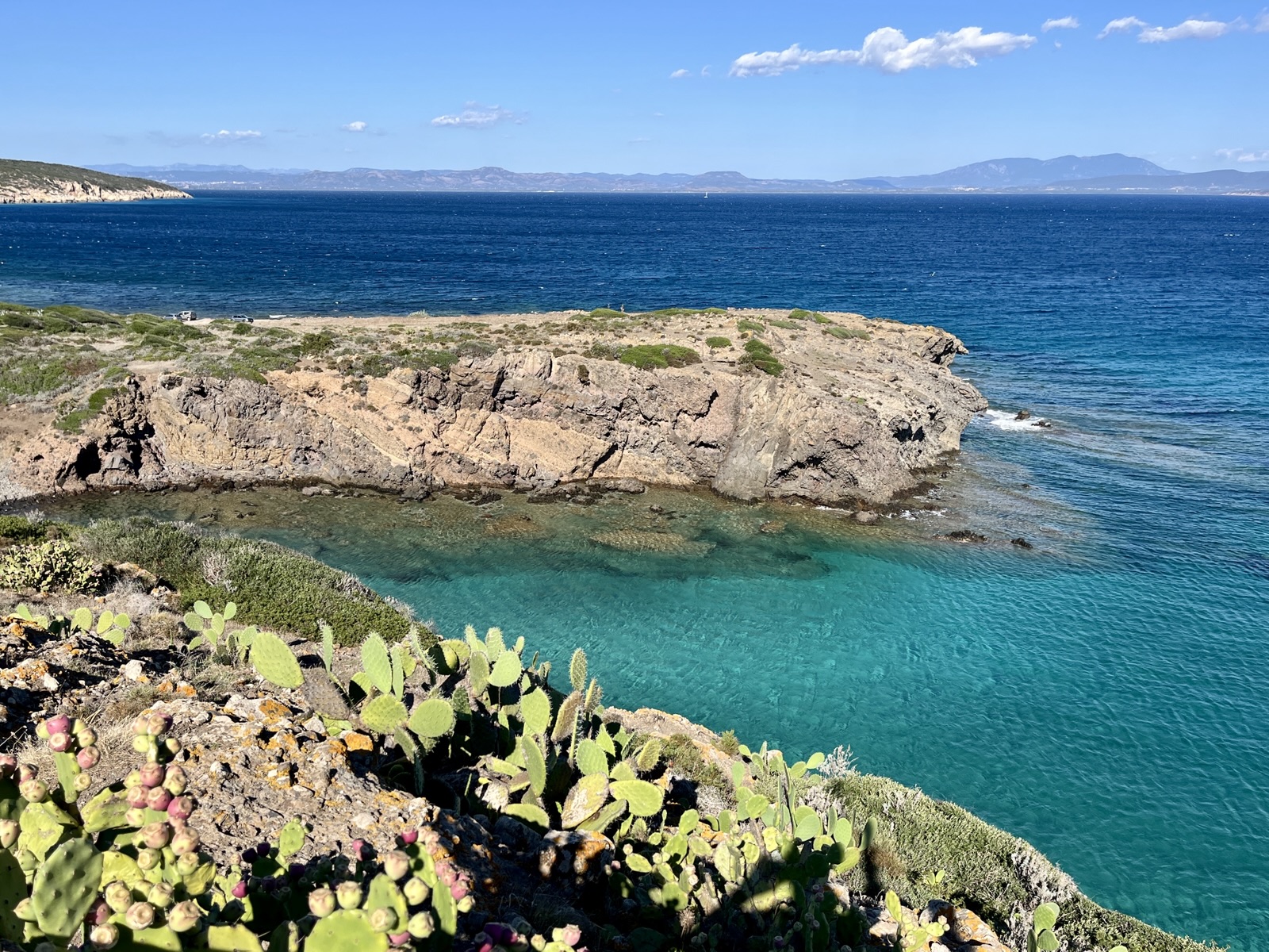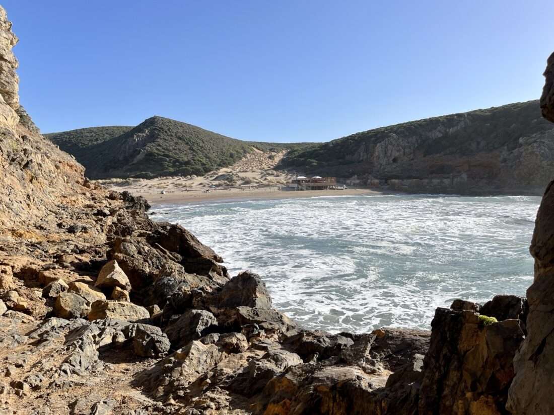 Uns ist nach Natur, Sonne und Bewegung im Freien – da kommt uns die über einen kleinen Damm mit dem Festland verbundene Isola di Sant‘Antioco im Südwesten Sardiniens gerade richtig. Wir finden einen Campingplatz etwa auf halber Höhe auf der Westseite. Ein guter Ausgangspunkt für Erkundungstouren in alle Richtungen. Eine Lage wie im Bilderbuch: eine Bucht mit einem kleinen Sandstrand, links und rechts ansteigende Felsen, die ins Meer hinausreichen. Und gleich oben eine nette Bar.