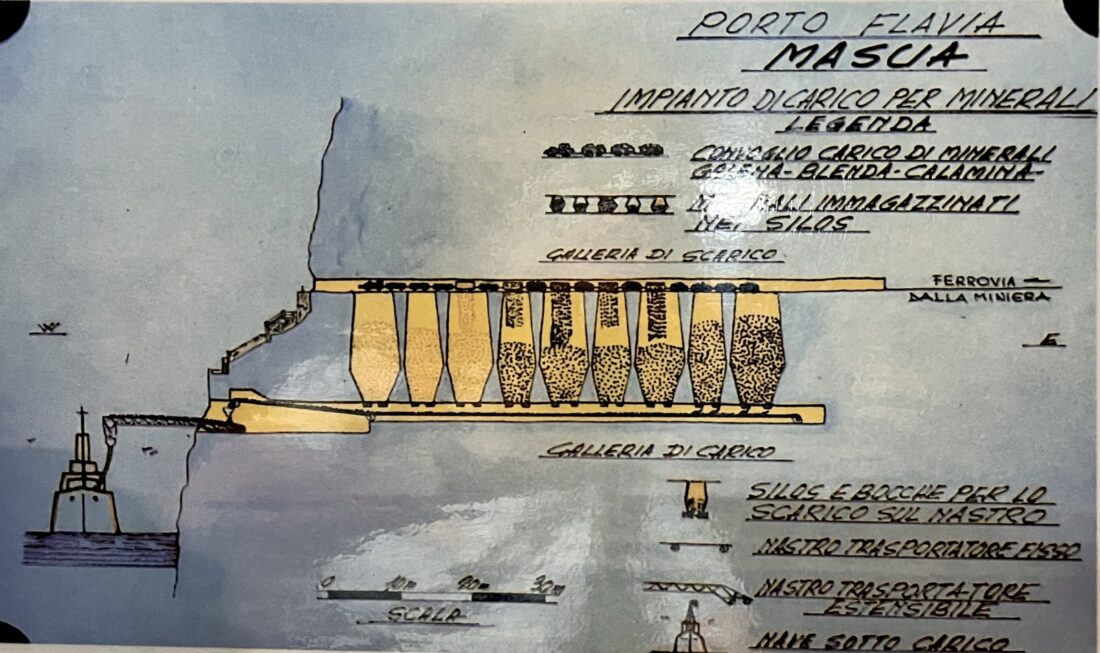 Bis Anfang der 1920-Jahre mussten die Bergarbeiter hier unter schwerster körperlicher Belastung Mineralien wie Zink und Blei in Körben zu kleineren Schiffen tragen, die die Bodenschätze dann zu größeren Schiffen transportierten. Dann ersann ein italienischer Bergbauingenieur namens Cesare Vecelli (1881-1947) ein revolutionär neues Verfahren, das er nach seiner ältesten Tochter Flavia benannte. Unter seiner Leitung wurden 1923/24 zwei lange Tunnel in das Bergmassiv gebohrt. Die Bodenschätze wurden mit einer Elektrobahn über Schienen zu 10 Meter tiefen Trichtern transportiert und fielen sodann auf ein Förderband, das über dem Meer mit einem beweglichen Arm verbunden war. Auf diese Weise ließen sich auch größere Schiffe direkt beladen. Auf einem historischen Foto wird das folgendermaßen dargestellt: