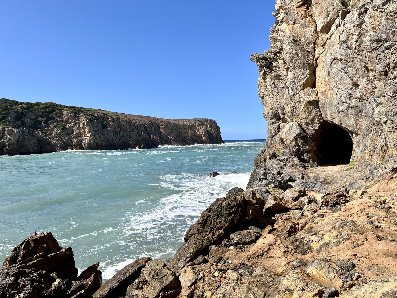 Rechter Hand sehen wir auf den Klippen einen Tunnel, der zu einer weiteren kleinen Smaragdbucht mit flach abfallendem Strand (Cala Lunga) führt, der vor den hereinbrechenden Wellen einigermaßen geschützt sein dürfte.