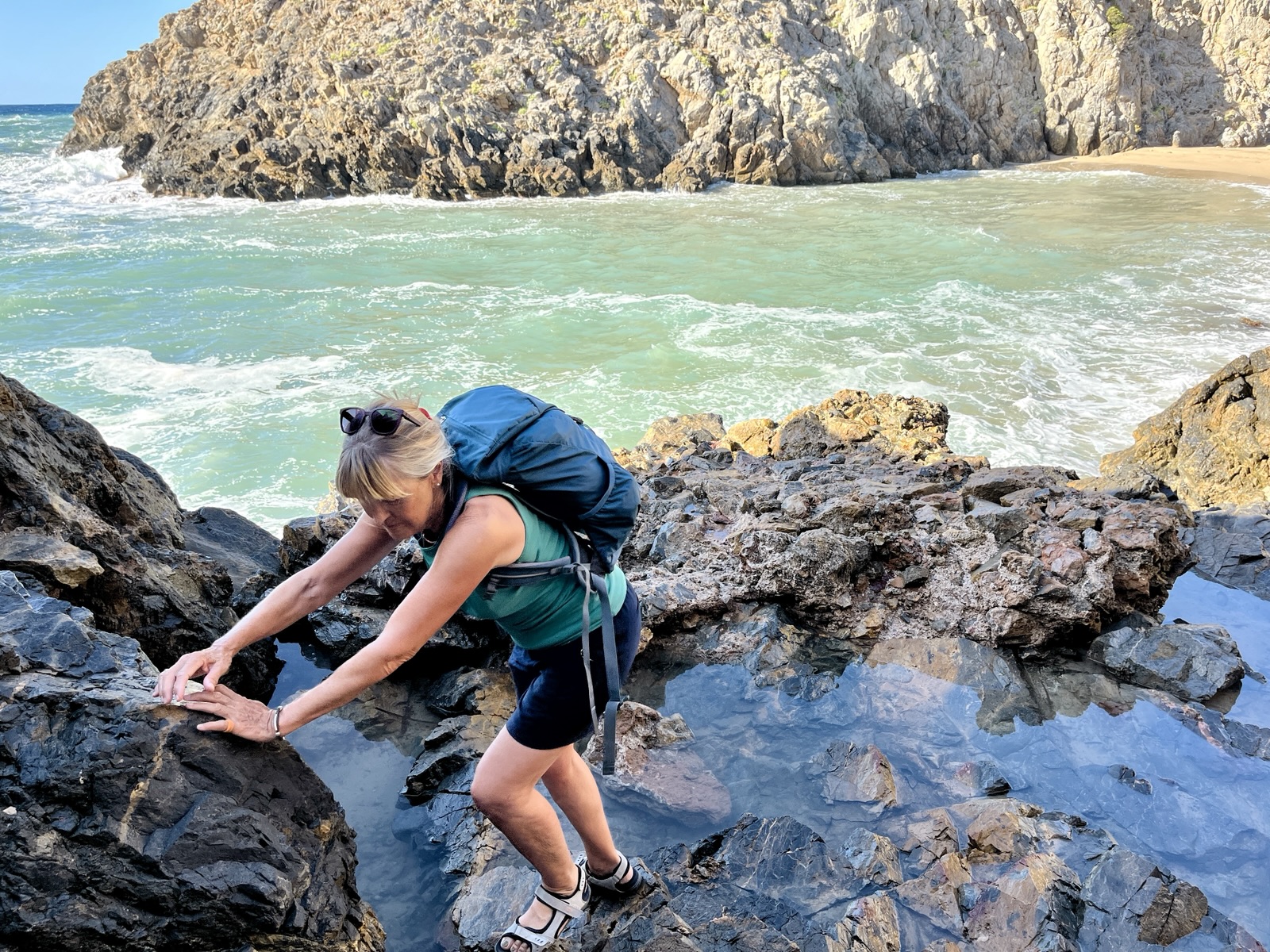 Wir kraxeln also über die rutschigen Felsen, immer mal wieder spritzt die Gischt in unserer Nähe hoch. Prickelnd.