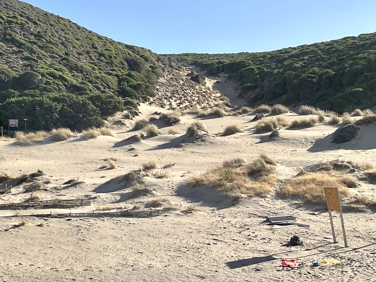 Von unserem Campingplatz sind es nur etwa 20 Kilometer. Kurz vor dem Ziel verlassen wir die Hauptstraße, folgen dem Schild „Cala Domestica“ etwa einen Kilometer entlang einem ausgetrockneten Flussbett und stellen das Auto auf einem Parkplatz ab. Fünf Euro für den Tag. Als wir den Holzsteg betreten, sehen wir schon den etwa 100 Meter breiten Strand, eingezwängt zwischen zwei Felswänden, links und rechts eine Bar. Die rote Fahne zeigt an, dass sich Schwimmer vorsehen müssen an diesem sonnigen Oktobertag.