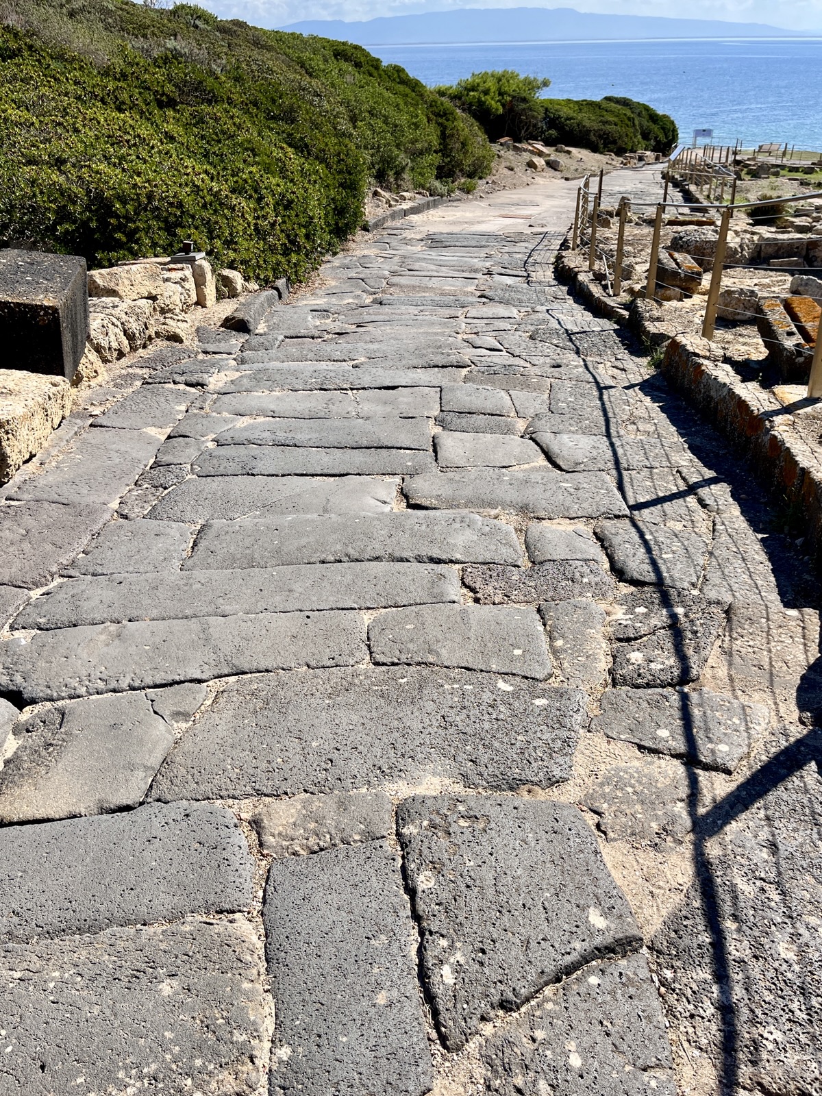 Die mit dunklen Basaltsteinen gepflasterte Hauptstraße (Cardo maximus), unter der zum Teil Abwasser-Kanäle verlaufen.