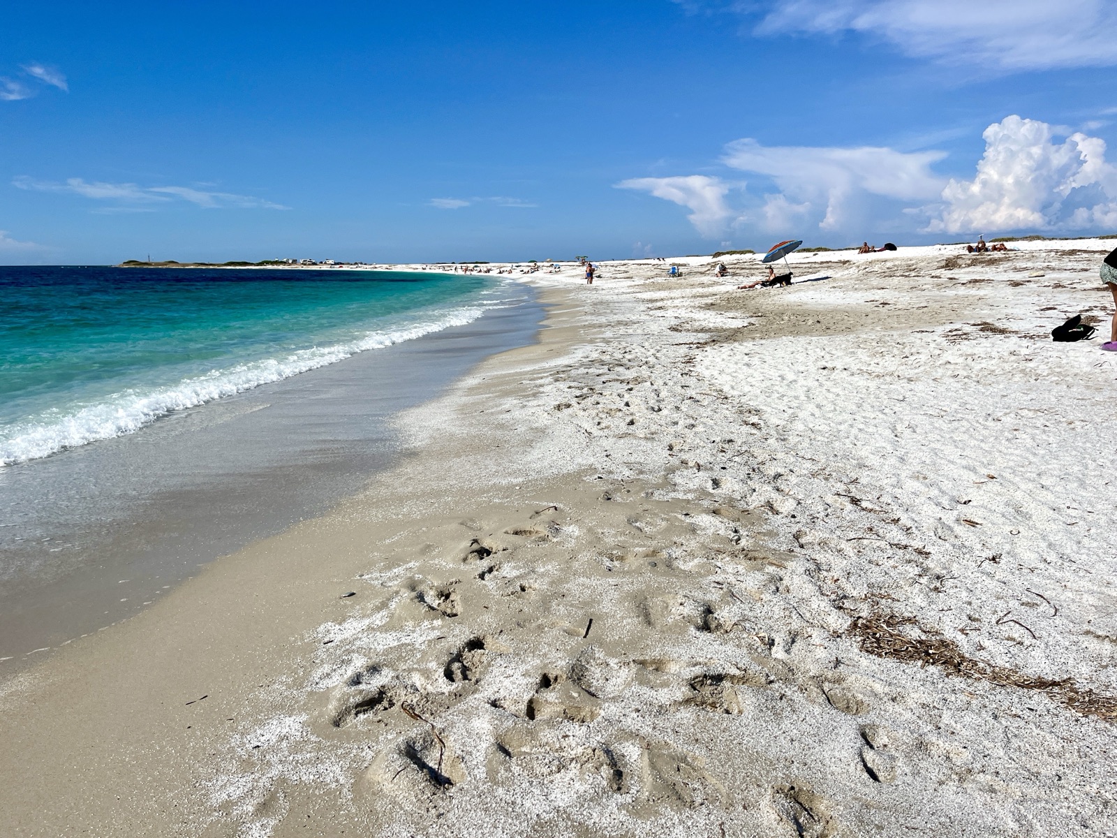 Der Strand ist phänomenal. Er zieht sich – wie die Dünen im Hintergrund – kilometerlang in beide Richtungen, das jeweilige Ende verschwindet im sommerlichen Dunst. Nach wenigen hundert Metern ist er fast menschenleer. Wir gehen einfach immer weiter und freuen uns am blautürkisfarbenen Meer, dem feinkörnigen Sand und dem weiten Blick.